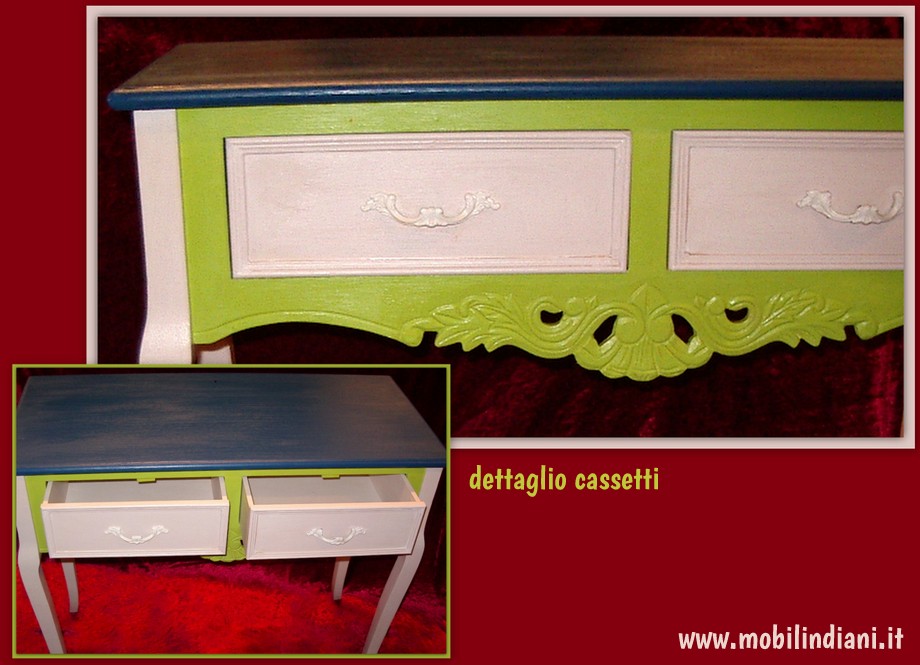 Disponibilità 1Mobile da ingresso stile vintage. Consolle in legno dipinto, due cassetti con maniglie in metallo colore bianco. Finitura verde acido, avorio e blu. Cm.90x40 h.78 Paese Italia RITIRO PRESSO NS. SEDE, COSTO ZERO. Per info chiedi su WhatsApp o mail: info@mobilindiani.it