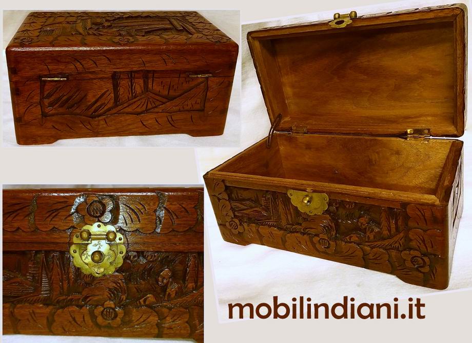 Bauletto orientale in canfora, finemente intagliato su tutti i lati. Elegante elemento d'arredo per la vs. casa. Cm.25x14 h.13 Condizioni perfette. COSTO TRASPORTO €. 12,81 Iva Inclusa.