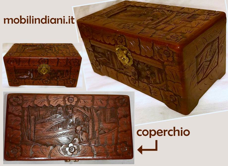Scatola cinese in legno di canfora, intagliato. Cm.25x14 h.13