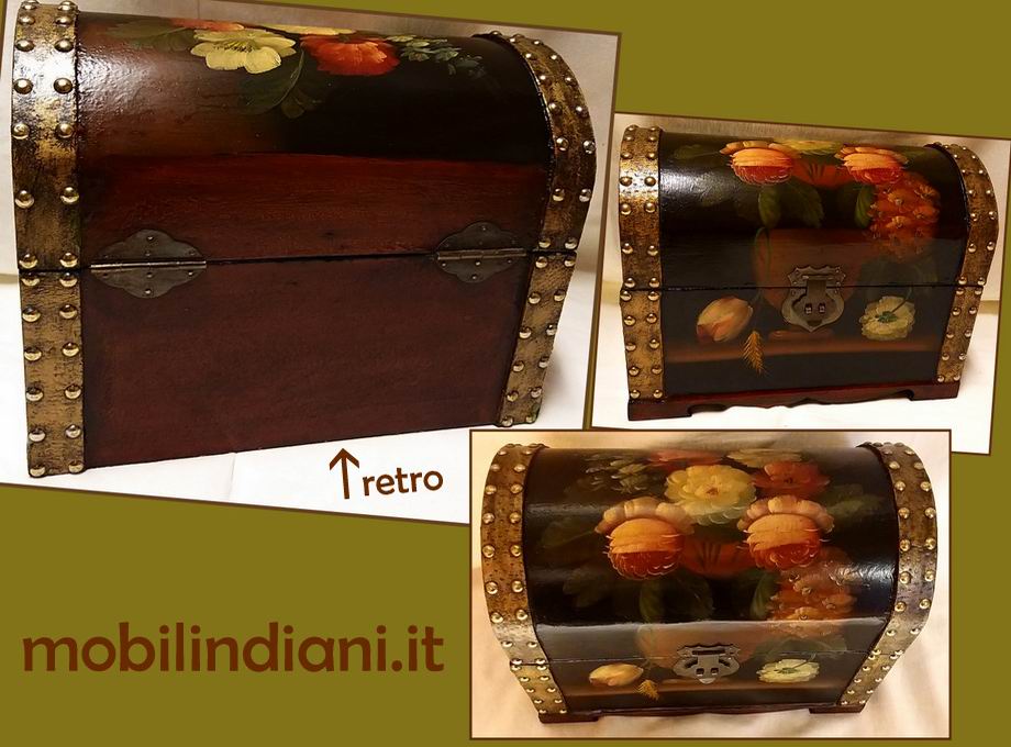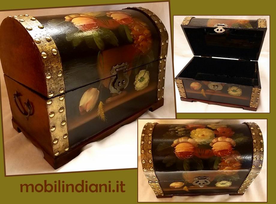 Bauletto orientale con coperchio bombato. Legno dipinto a mano con bordi rivettati in ottone, maniglie in ferro. Cm.34x20 h.26 Paese Shanxi, Cina. COSTO TRASPORTO €. 12,81 Iva Inclusa. Per costi trasporto Isole, chiedi info su WhatsApp o mail: info@mobilindiani.it