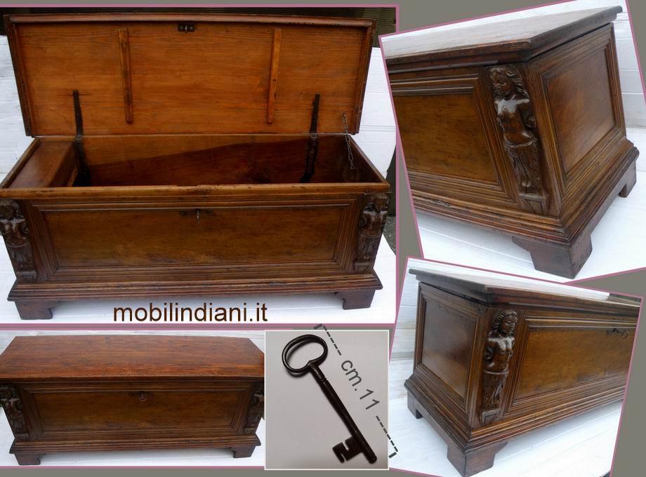 Disponibilità 1Cassapanca antica in noce + legni misti. Periodo '700 autentica e restaurata. Serratura funzionante, chiave annessa. Cm.160x54,5 h.67 Paese Italia PER INFO COSTI SPEDIZIONE CHIEDI su WhatsApp o via mail: info@mobilindiani.it