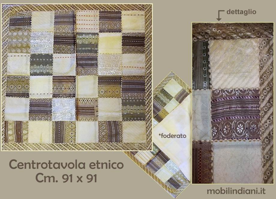 Disponibilità 1Centro tavola etnico lavorazione patchwork. Realizzato a mano con tessuti indiani dal particolare effetto cangiante. Foderato sul retro. Paese Rajasthan, India. Cm.91x91 COSTO TRASPORTO €. 8,80 Iva Inclusa