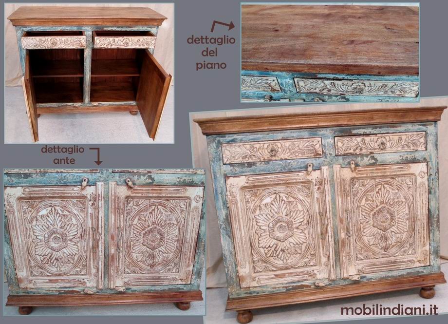 Disponibilità 1Credenza indiana in teak riciclato intagliato, finitura decapata. 2/ante + 2/cass. Cm.126x46 h.111 Paese Rajasthan, India PER INFO COSTI SPEDIZIONE CHIEDI su WhatsApp o via mail: info@mobilindiani.it
