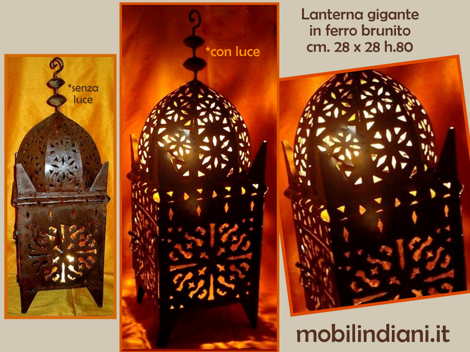 Disponibilità 1Grande lanterna araba in ferro traforato brunito. Cm. 28x28 h.80 Paese Marrakech, Marocco. Lanterna marocchina da poggiare come oggetto d'arredo e creare giochi di luce su pareti e soffitti. COSTO TRASPORTO €. 24,40 Iva Inclusa. Per costi trasporto Isole, chiedi info su WhatsApp o mail: info@mobilindiani.it