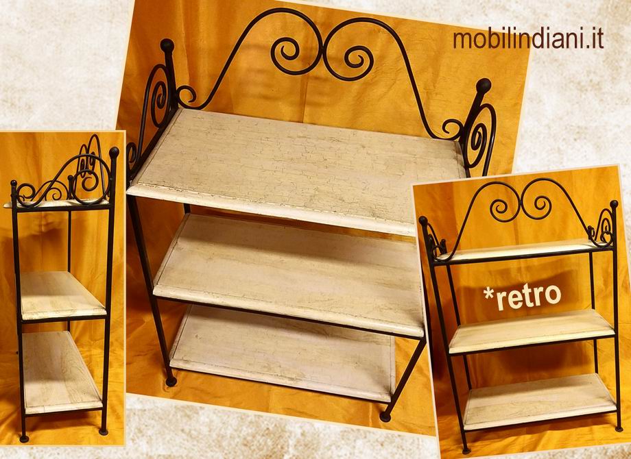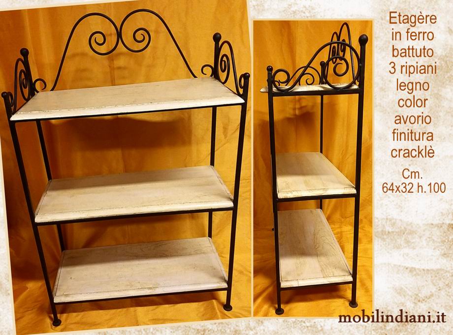 Disponibilità 1Etagère 3/ripiani in legno, finitura crackle color avorio. Struttura in ferro battuto pieno. Cm.64x32 h.100 Paese India COSTO TRASPORTO €. 39,96 Iva Inclusa. Per costi trasporto Isole, chiedi info su WhatsApp o mail: info@mobilindiani.it