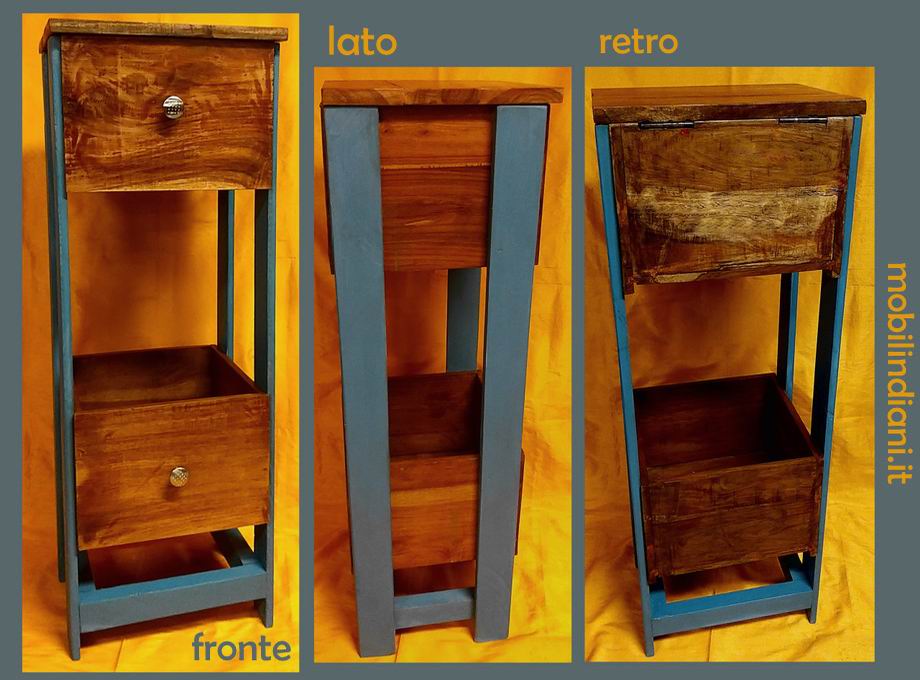Mobiletto stile vintage alto 1 cassetto con coperchio + 1 cassetto aperto. Fasce laterali color "jeans" Realizzato artigianalmente in legno sheesham (noce) massello, molto robusto.Cm.35,5x31 h.103 COSTO TRASPORTO €. 35,38 Iva Inclusa. Per costi trasporto Isole, chiedi info su WhatsApp o mail: info@mobilindiani.it