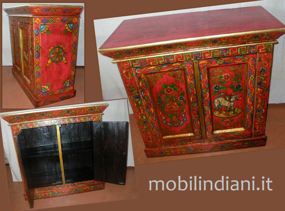 Credenza tibetana antica, realizzata e dipinta artigianalmente da esperti artigiani locali; un vero e proprio elemento di contrasto. Cm.98x49 h.94 Origine Tibet PER INFO COSTI SPEDIZIONE CHIEDI su WhatsApp o via mail: info@mobilindiani.it