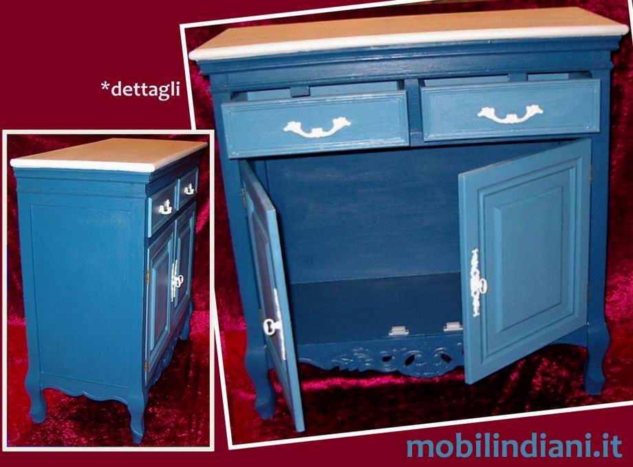 Disponibilità 1Mobili seconda casa. Mobiletto in legno dipinto 2/cass 2/ante, maniglie in metallo colore bianco. Finitura blu, avorio e color jeans, stile retrò. Cm.78x36 h.80 Paese Italia. RITIRO PRESSO NS. SEDE COSTO ZERO - Per info chiedi su WhatsApp o mail: info@mobilindiani.it.
