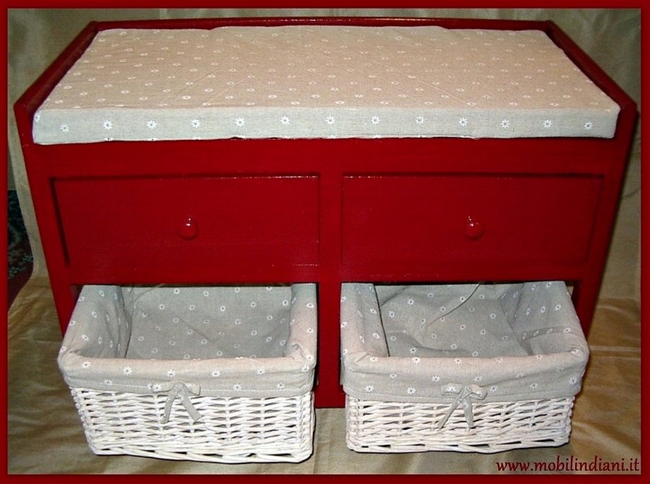 Disponibilità 1Panca etnica in legno, colore rosso tibetano. 2/cass + 2 cesti in giunco foderati. Completa di cuscino sfoderabile con zip. Cm.69x34 h.48 RITIRO PRESSO NS. SEDE COSTO ZERO. Per info chiedi su WhatsApp o mail: info@mobilindiani.it