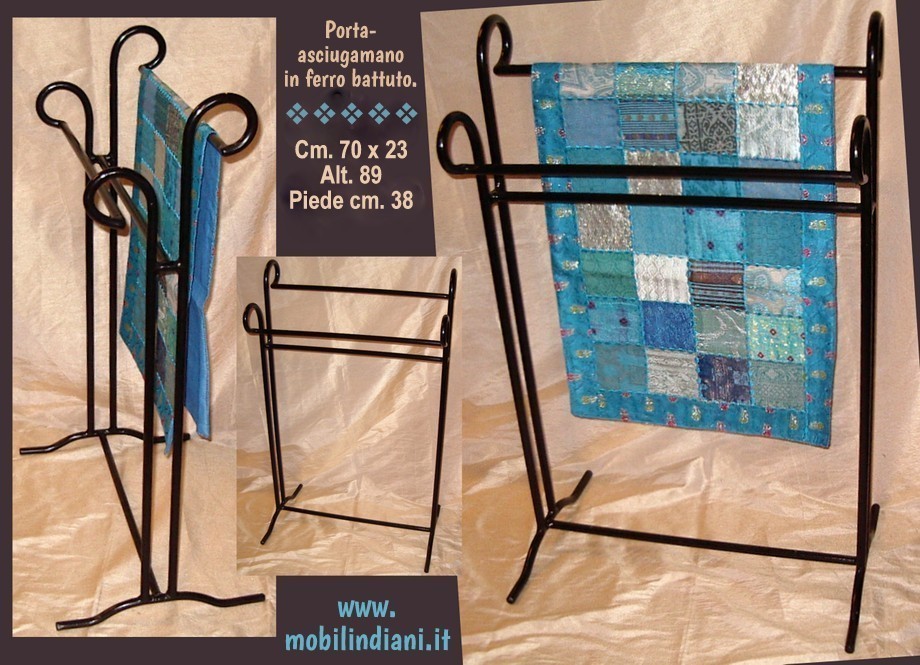 Portasciugamani in ferro battuto verniciato a forno, colore nero. Cm.70 x prof 23 h.89 Larghezza del piede cm.38 Realizzato artigianalmente in Italia. COSTO TRASPORTO €. 29,00 iva inclusa. Per trasporto Isole invia mail a info@mobilindiani.it