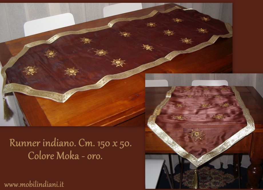 Striscia etnica per tavolo. Lungh. cm.150+fiocchetti. Largh cm.50 color caffè, passamaneria oro. Paese India COSTO TRASPORTO €. 8,80 Iva Inclusa