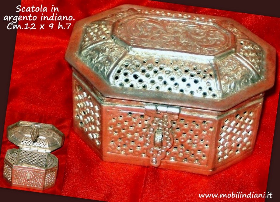 Cofanetto etnico per pot pourri finemente cesellato. Cm.12x9 h.7 - Peso gr. 260 - Paese India. Ideale come porta gioie o pot pourri. COSTO TRASPORTO €. 8,80 iva inclusa.