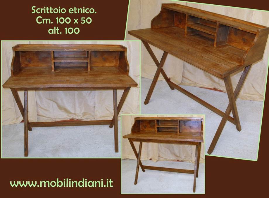 Disponibilità 1Scrivania etnica con alzatina e vani a giorno. Cm.100x50 h.100 Legno abete spazzolato finitura noce, gambe a cavalletto. RITIRO PRESSO NS. SEDE, COSTO ZERO Per info chiedi su WhatsApp o mail: info@mobilindiani.it