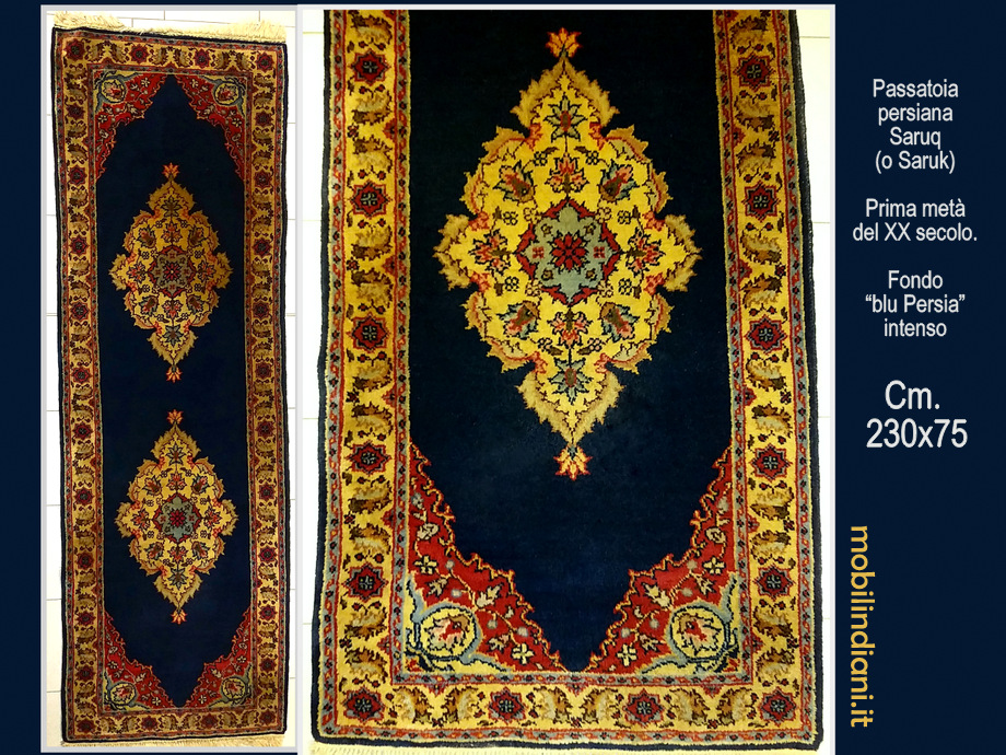 Passatoia persiana Saruq (o Saruk) Epoca prima metà XX Secolo. Fondo "blu Persia" intenso, medaglioni centrali e bordura floreale color crema. Cm.230x75 Tappeto pregiato di solidità struttura, lana soffice, eccellente e compatta (vedi foto) caratteristiche che li hanno resi famosi in tutto il mondo. Il tappeto Saruq, rientra nelle categorie più alte di tappeti persiani. COSTO TRASPORTO €. 29,00 Iva Inclusa. Per costi trasporto Isole, chiedi info su WhatsApp o mail: info@mobilindiani.it