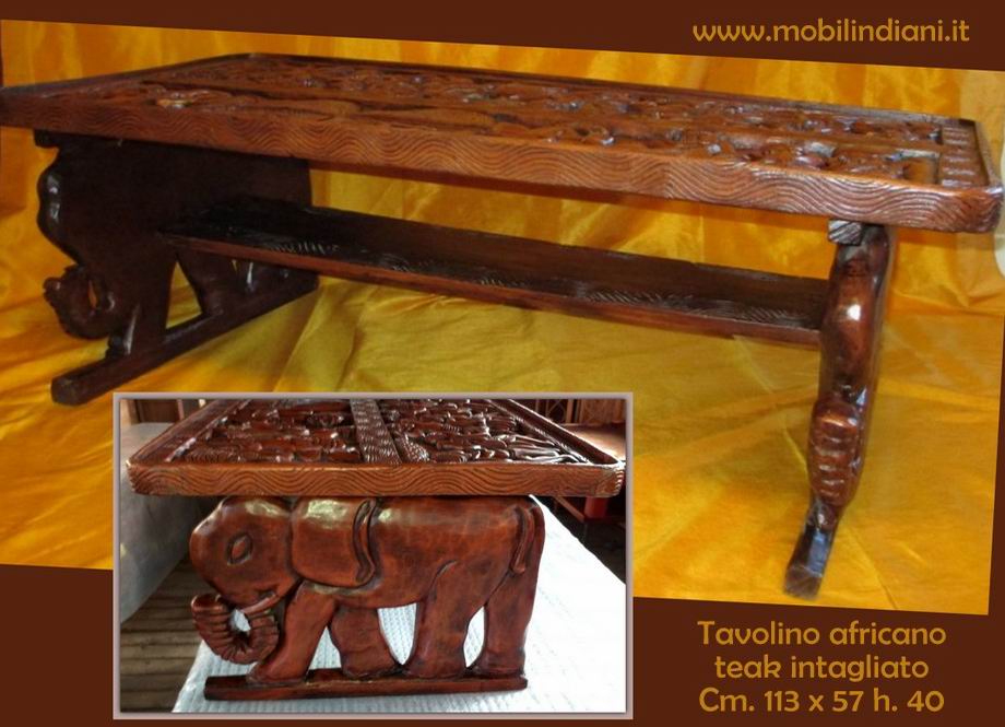 Disponibilità 1Tavolo tribale africano con intagli, piedi ad elefante. Realizzato in teak, tipico legno per la produzione di mobili africani. Cm.113x57 h.40 Origine Africa RITIRO PRESSO NS. SEDE COSTO ZERO - Per info chiedi su WhatsApp o mail: info@mobilindiani.it