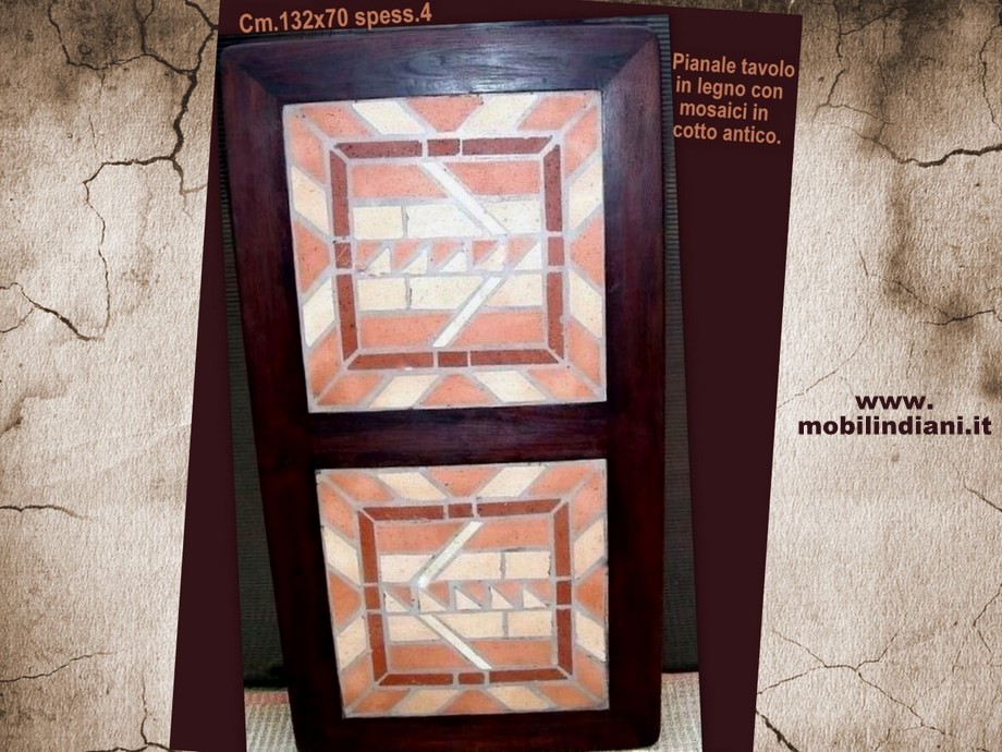 Tavolo con cornice in noce e mosaico in mattoni antichi in cotto. Cm.132x70 spess.4 Trattamento antimacchia. Prodotto in Italia INCLUSE GAMBE IN LEGNO A SCELTA CON STESSO TONO DI COLORE - PER INFO COSTI SPEDIZIONE CHIEDI su WhatsApp o via mail: info@mobilindiani.it