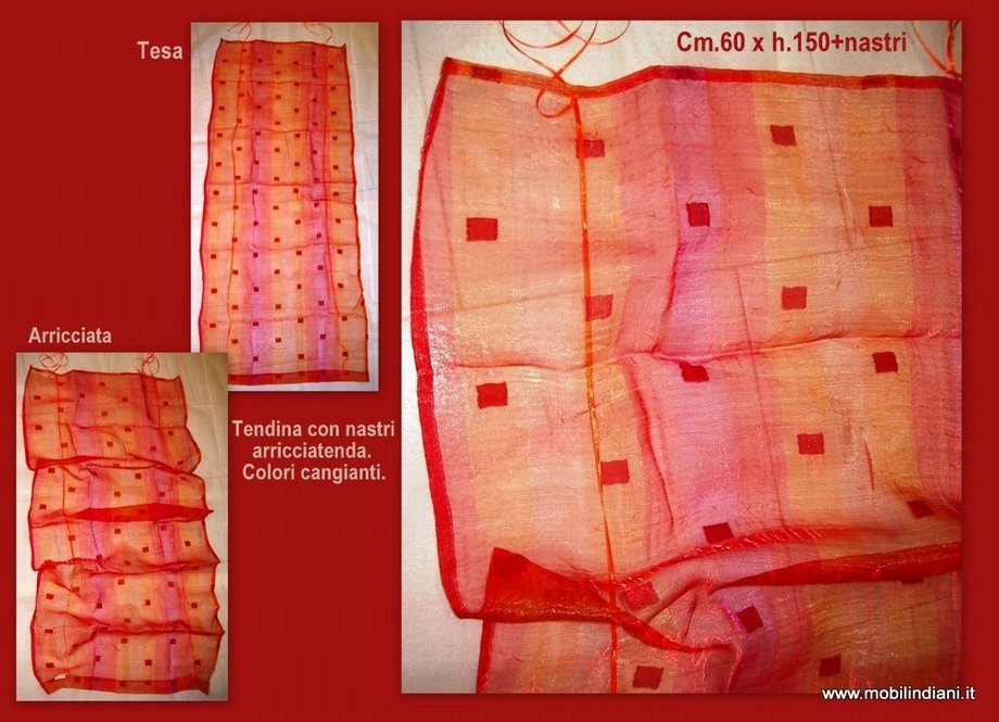 Disponibilità 14Tendina etnica a finestra con nastro arricciatenda che regola l'altezza. Tessuto cangiante semi-trasparente effetto stropicciato, colore con diverse sfumature rosso, arancio, lilla. Lavaggio ad acqua 30° NO STIRO Cm.60 h.150 Paese India. €. 6,50/cd. - Acquisto minimo 2/pz. COSTO TRASPORTO PER 2/Pz. €. 8,80 Iva Inclusa