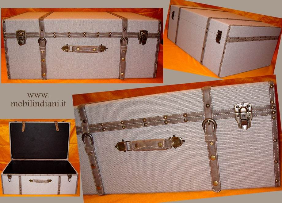 Valigia d'arredamento ideale per conservare la biancheria. Rivestita in tessuto anche all'interno. Mareriale legno rivestito color grigio chiaro. Cinghie in ecocuoio, rivetti color bronzo, ganci di chiusura a chiavistello. Cm.74x51 h.32 Paese Francia. COSTO TRASPORTO €. 35,38 iva inclusa. Per trasporto Isole invia mail a info@mobilindiani.it